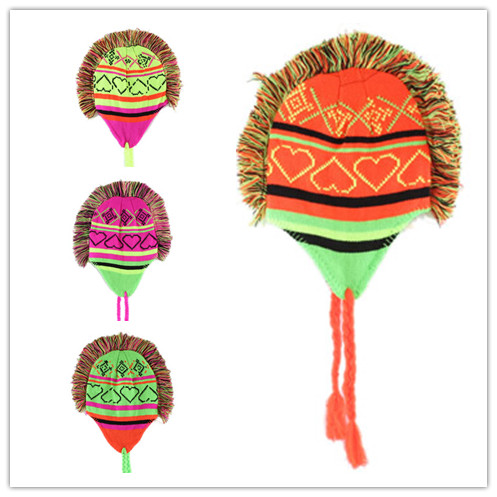 Mohawk Style Knit Hat With Ear Flaps And Braided Rope Chin Straps.